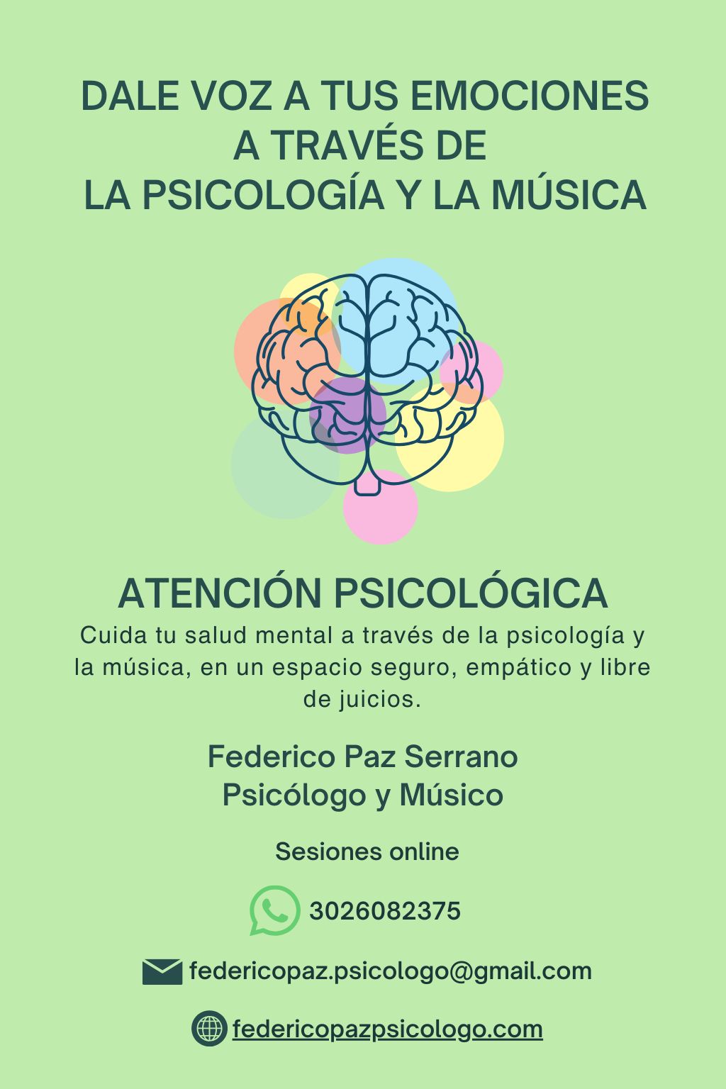 Soy Federico Paz Serrano, psicólogo y músico, y combino ambas pasiones para ofrecer un espacio de escucha, confianza y acompañamiento.